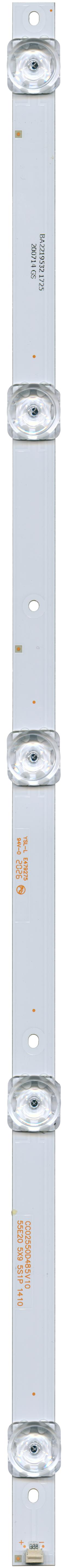 Светодиодный модуль CC02550D485V10 (9 планок по 485 мм, 5 линз) — описание:З/Ч для LED TV и мониторов Для ТВ с диагональю 55". Алюминиевое основание. Напряжение питания светодиодов 3В. В телевизоре установлено 9 планок. Подсветка для ТВ Dexp U55E9000Q. Подсветка для ТВ HI 55US131XS. Подсветка для ТВ Supra STV-LC55ST3000U.