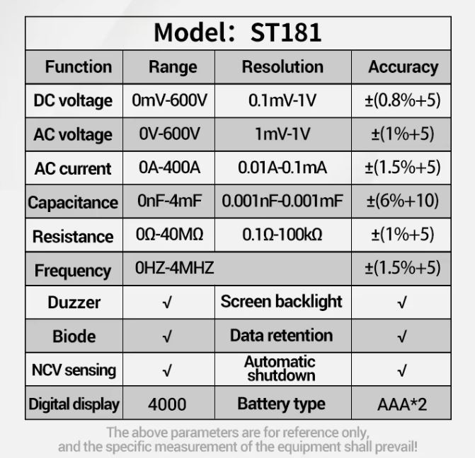 Характеристики: Может измерять напряжение переменного/постоянного тока, силу переменного тока, сопротивление и проверять целостность цепи. Ручной выбор функции и диапазона измерений. Защита от перегрузки во всем диапазоне измерений. ЖК-дисплей с подсветкой, удобный для работы и считывания показаний. Функция удержания показаний, индикация низкого заряда батареи, автоматическое отключение питания. Подходит для тестирования и обслуживания электрооборудования. Технические характеристики: Функция Диапазон Точность ПЕРЕМЕННОЕ напряжение 4 В/40 В/400 В/600 В ±(1.5%+3) Напряжение постоянного тока 400 мВ/4 В/40 В/400 В/600 В ±(1.0%+3) Сопротивление 400/4 кОм/40 кОм/400 кОм/4 МОм ±(1.2%+3) 40M omh ±(1.5%+5) Переменный ток 40A/400A ±(2.5%+3) Частота 10 Гц-400 кГц ±(1.0%+5) 400 кГц-4 МГц ±(2.0%+5) Емкость 1nF-4uF ±(2.5%+10) 4 мкФ-400 мкФ ±(4.0%+20) 4mF ±(5.0%+30) Рабочая температура 18 - 28℃ Комплектация: 1 токовый клещи ST181 (без батареи) 2 измерительных провода 1 руководство пользователя 1 X Сумка для хранения 1 X Упаковочная коробка