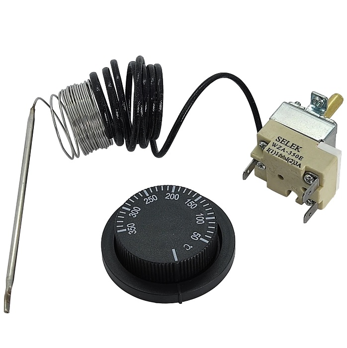 Термостат WZA-350E с переключающим контактом и диапазоном регулирования от 50°C до 350°C. Датчик температуры изготовлен из нержавеющей стали и представляет собой капиллярную трубку длиной 2,5м, припаянную к трубчатому датчику диаметром 3мм и длиной 130мм. Нагрузка на контакты: C-1: 16А/250В АС; C-2: 3A/250В АС. Технические параметры